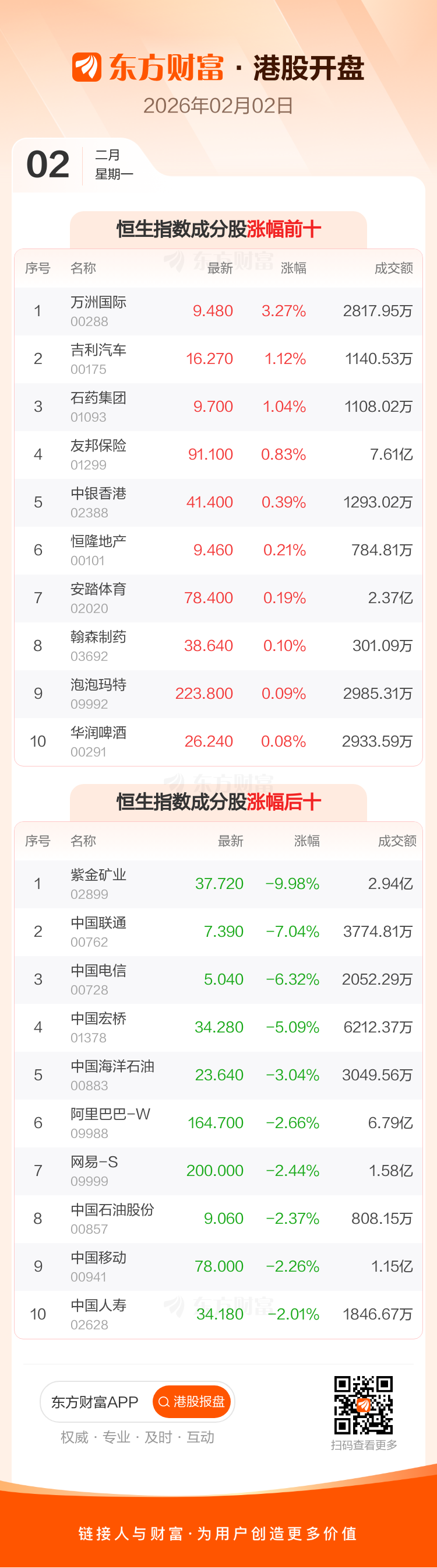 2月2日港股开盘:恒指低开1.06% 紫金矿业领跌成分股