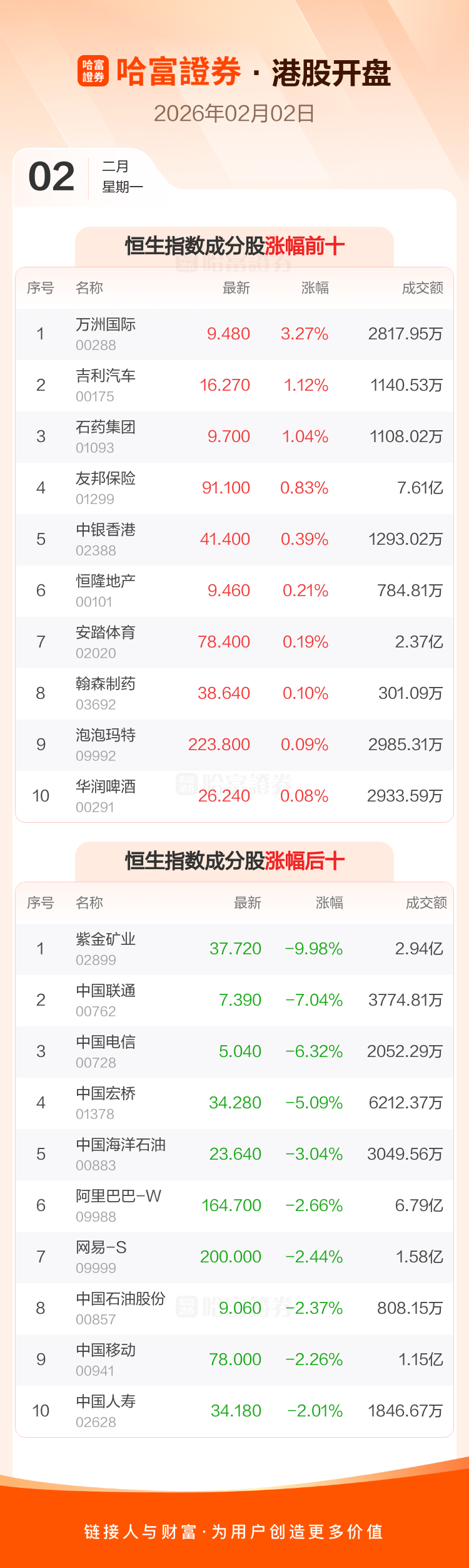 港股2月2日低开 ,恒生指数开盘报27097.34点,跌289.77点,跌幅1.06%;恒生科技指数开盘报5644.38点,跌73.8点,跌幅1.29%。恒生指数成分股中万洲国际、吉利汽车、石药集团涨幅居前,紫金矿业、中国联通、中国电信跌幅靠前。恒生科技指数成分股中同程旅行、地平线机器人-W、联想集团涨幅居前,小鹏汽车-W、阿里巴巴-W、哔哩哔哩-W跌幅靠前。