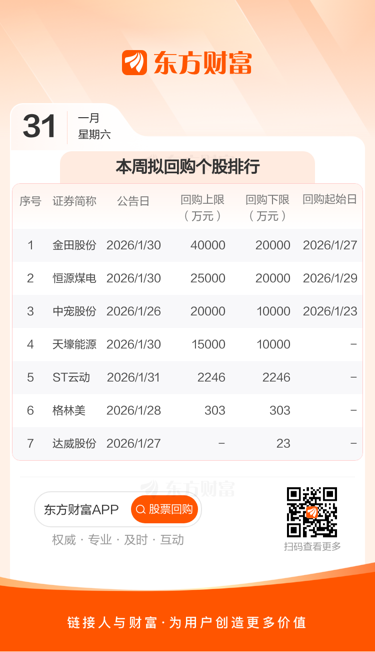 本周有7家公司宣布回购计划,按拟回购金额上限统计,计划回购金额10.25亿元。其中金田股份拟回购金额上限最高,为4.00亿元。