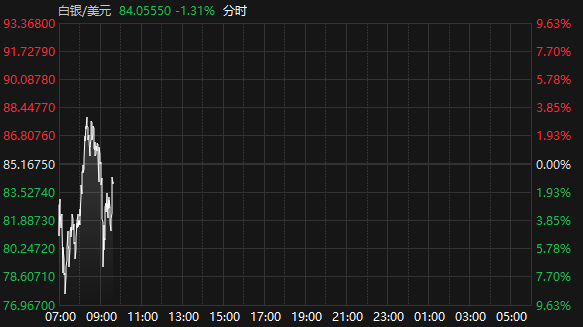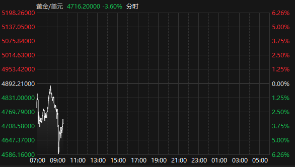 上证报中国证券网讯据Choice数据,2月2日早盘,国际现货黄金白银延续跌势,截至9:38,现货黄金报4716.20美元/盎司,跌3.6%,盘中一度跌破4600美元/盎司关口;现货白银报84.06美元/盎司,跌1.31%,盘中一度跌破77美元/盎司。
