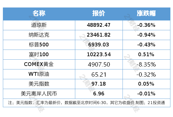 纽约股市三大股指1月30日下跌。截至1月30日收盘,道琼斯工业平均指数比前一交易日下跌179.09点,收于48892.47点,跌幅为0.36%;标准普尔500种股票指数下跌29.98点,收于6939.03点,跌幅为0.43%;纳斯达克综合指数下跌223.30点,收于23461.82点,跌幅为0.94%。