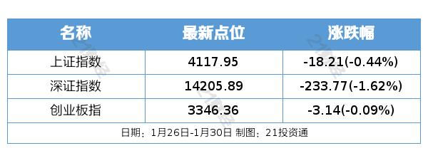 过去一周(1月26日—1月30日)A股三大指数震荡收跌。截至1月30日收盘,上证指数报4117.95点,周跌0.44%;深成指报14205.89点,周跌1.62%;创业板指报3346.36点,周跌0.09%。