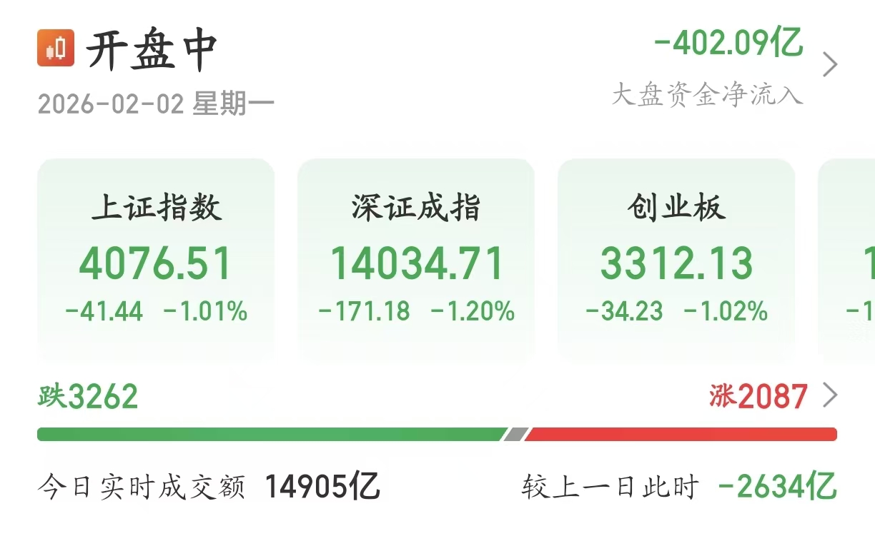 【大河财立方消息】2月2日,A股指数走弱,沪指下挫跌逾1%,深成指跌1.20%,创业板指跌1.02%。有色金属、油气、农业、半导体芯片等方向跌幅居前,沪深京三市下跌个股超3200只。