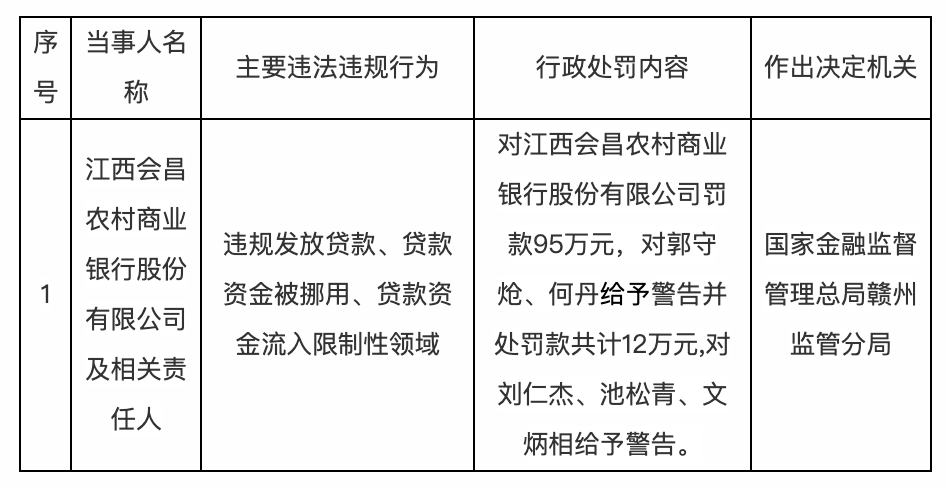 公开表显示,因违规发放贷款、贷款资金被挪用、贷款资金流入限制性领域,国家金融监督管理总局赣州监管分局对江西会昌农村商业银行股份有限公司罚款95万元,对郭守炝、何丹给予警告并处罚款共计12万元,对刘仁杰、池松青、文炳相给予警告。