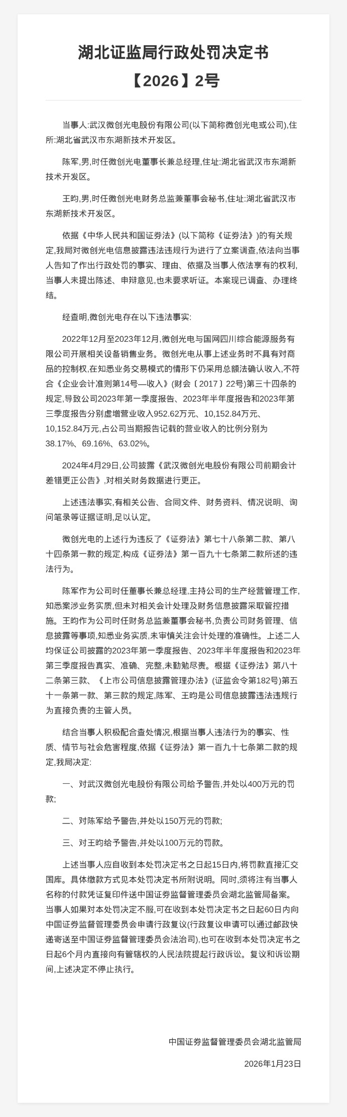 对此,中国证券监督管理委员会湖北监管局决定对武汉微创光电股份有限公司给予警告并处以400万元罚款;对陈军给予警告并处以150万元罚款;对王昀给予警告并处以100万元罚款。