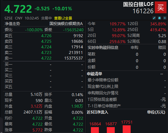 【大河财立方消息】2月2日10时30分,国投白银LOF复牌跌停,溢价率收窄至43.8%。
