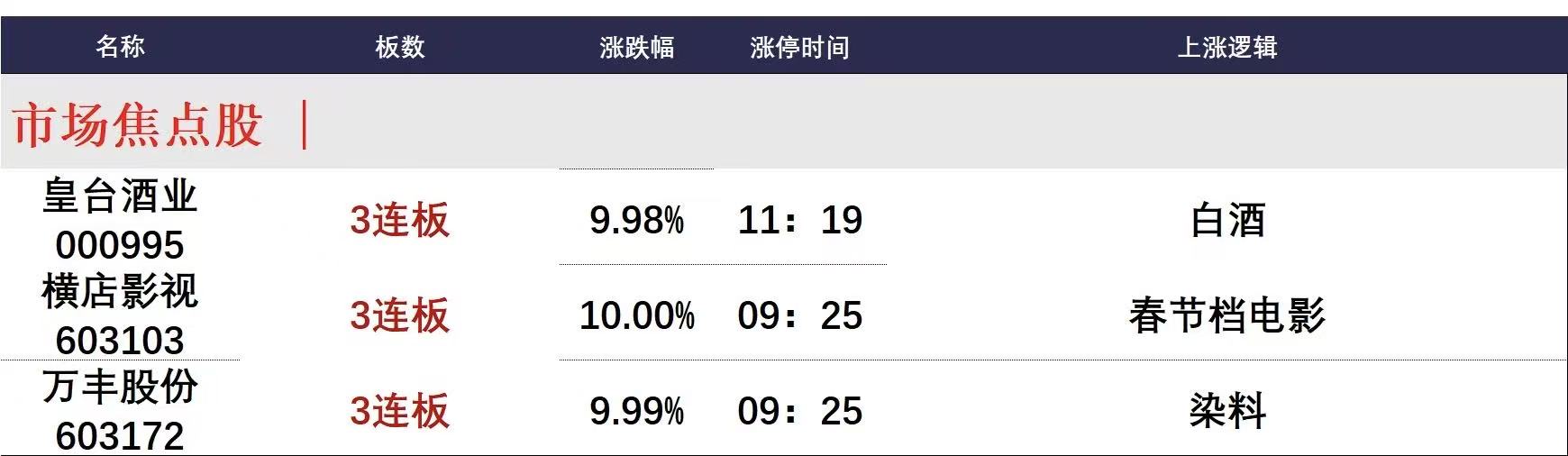 今日午盘全市场共33股涨停,连板股总数9只,16股封板未遂,封板率为67%(不含ST股、退市股)。焦点股方面,白酒股皇台酒业3连板,影视股横店影视3连板,化工股万丰股份3连板。