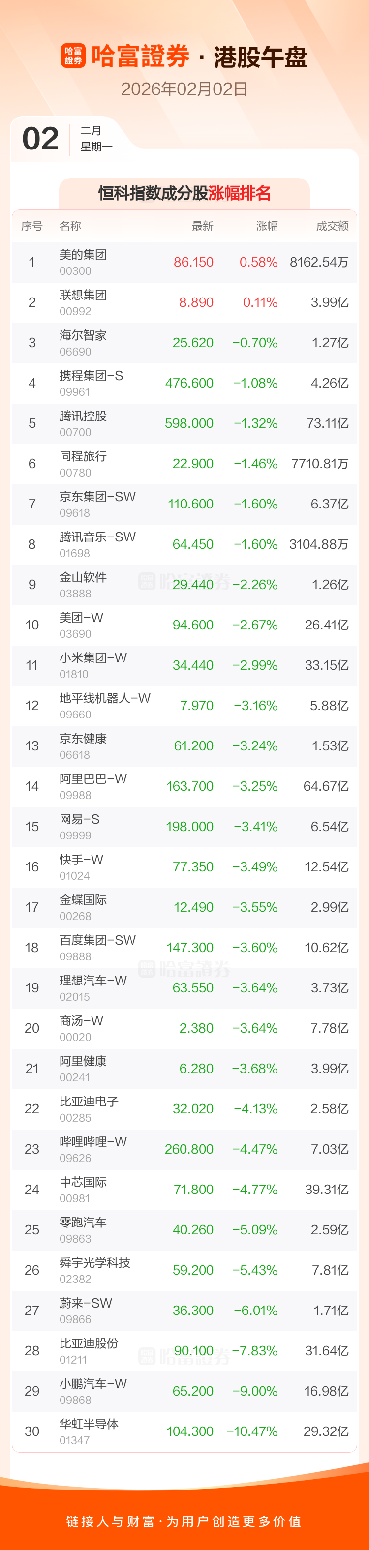 港股2月2日午盘走低 ,恒生指数收报26730.78点,跌656.33点,跌幅2.4%;恒生科技指数收报5508.01点,跌210.17点,跌幅3.68%。恒生指数成分股中金沙中国有限公司、蒙牛乳业、泡泡玛特涨幅居前,中国联通、比亚迪股份、中国电信跌幅靠前。恒生科技指数成分股中美的集团、联想集团、海尔智家涨幅居前,华虹半导体、小鹏汽车-W、比亚迪股份跌幅靠前。