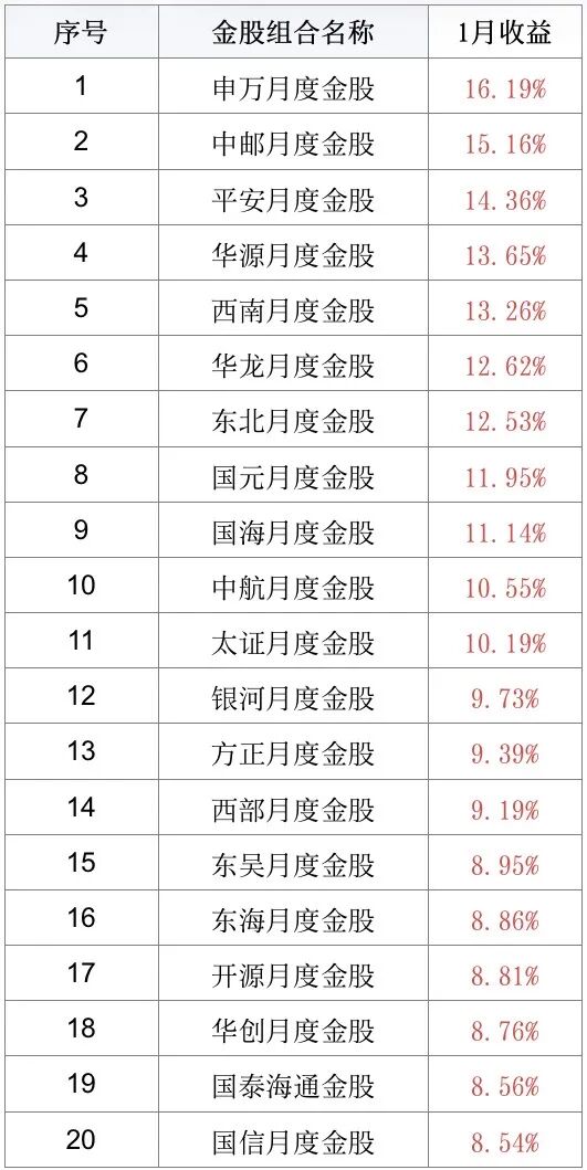 从机构组合的整体表现来看,申万宏源月度金股组合以16.19%的月涨幅排名第一,该券商1月推荐的10只金股中有7只单月涨逾17%。中邮证券月度金股组合以15.16%的涨幅排名第二;平安证券、华源证券、西南证券、华龙证券、东北证券金股组合也在1月获得超10%的月度收益率。
