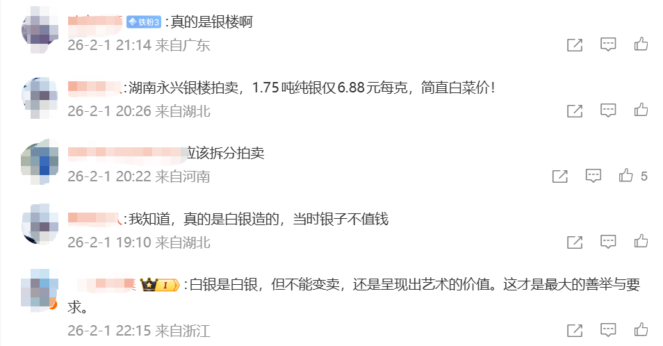 法拍平台信息显示,该楼纯银含量为70%,共用了1.75吨纯银;评估价值为12047000元,折算后单价相当于每克纯银6.88元。