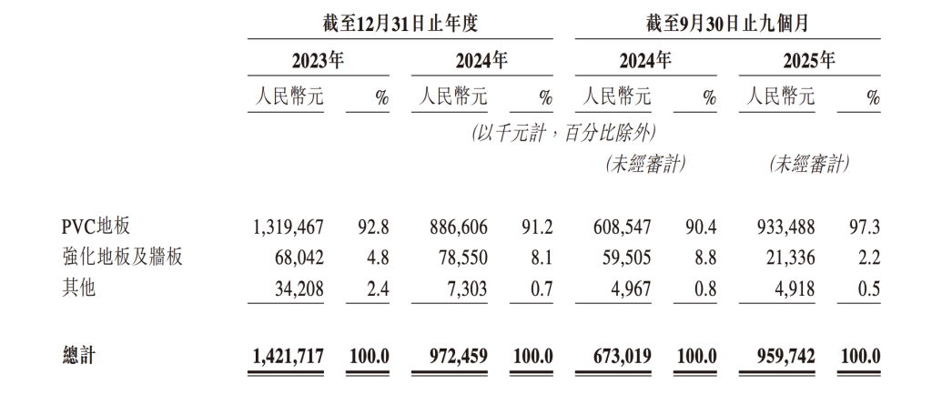 财务数据显示,2023年及2024年以及截至2025年9月30日止九个月,公司的收入分别为14.2亿元、9.72亿元及9.59亿元。公司收入主要来自销售PVC地板,同时也在销售强化地板及墙板以及其他产品,但目前的收入占比还较低。