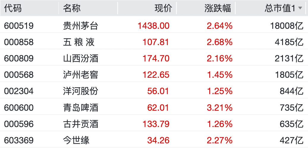 皇台酒业盘中涨停,水井坊盘中一度涨停。金徽酒盘中涨幅超过9%,金种子酒盘中涨幅超过8%,后涨幅有所收窄。五粮液、山西汾酒、青岛啤酒均涨超2%。
