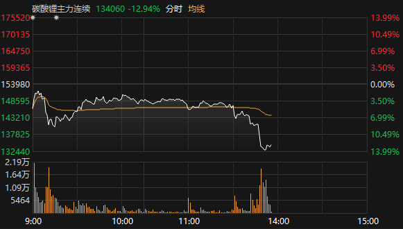 上证报中国证券网讯据Choice数据,2月2日,碳酸锂连续主力合约午后一度触及跌停,截至13:55报134060元/吨,日内跌12.94%。