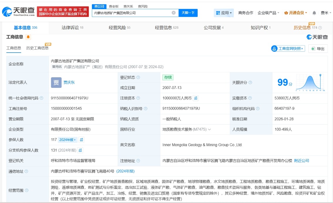 每经AI快讯,天眼查App显示,近日,内蒙古地质矿产集团有限公司发生工商变更,注册资本由5.38亿元人民币增至100亿元人民币,增幅约1759%,同时,多位高管发生变更。该公司成立于2007年7月,法定代表人为贾庆东,经营范围包括投资经营与管理、矿业权经营、矿产地质普查勘探、区域地质调查等,由内蒙古自治区人民政府国有资产监督管理委员会、内蒙古国有资本运营有限公司共同持股。