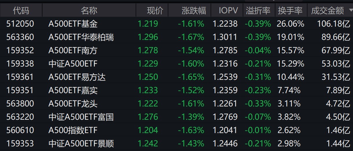 市场早盘震荡调整,中证A500指数下跌1.41%,2只中证A500相关ETF成交额超89亿元