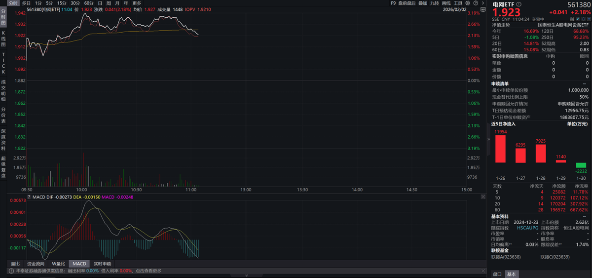 2月2日,在大盘震荡之中,电网ETF(561380)涨超2%,资金抢筹布局,近20日净流入超17亿元。