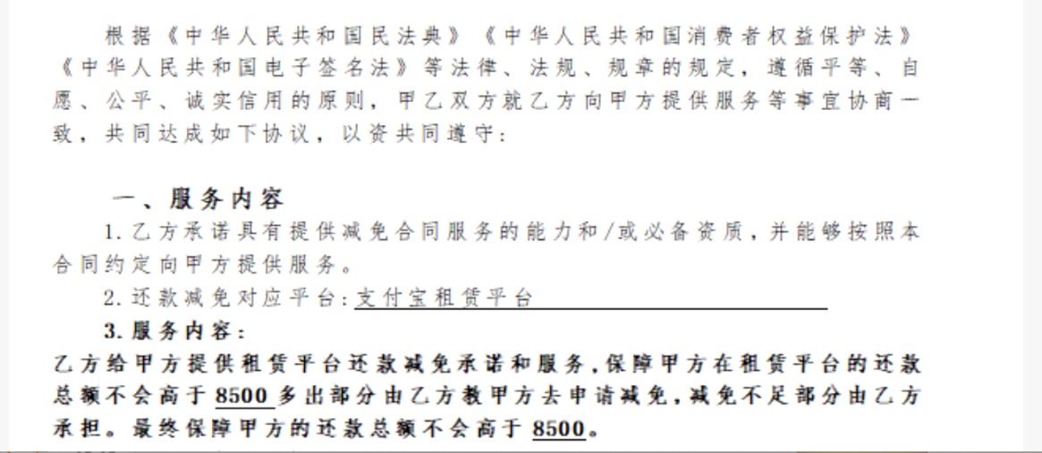 减免合同显示,最终保障还款总额不会高于8500,但还款减免对应平台仅显示为“支付宝租赁平台”。