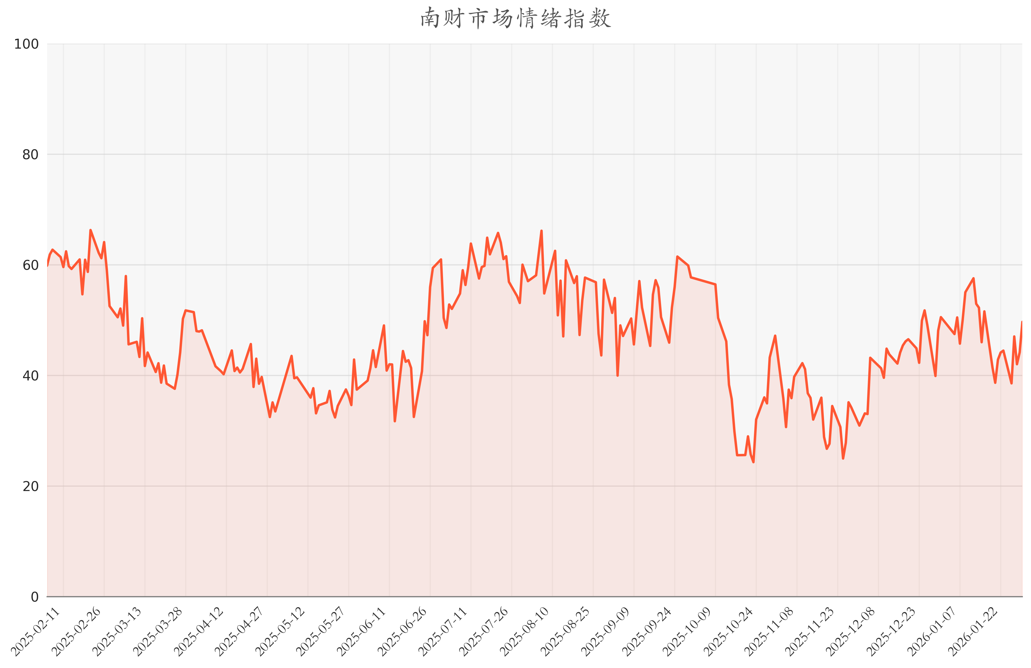 南财智讯2月2日电,今日南财市场情绪指数为49.71,较前一交易日44.2大幅上涨,市场投资热度明显提升。从各个细分指标结果上看,股债回报差与两融交易额占比处于近一年来较低水平,说明投资者认为市场趋于触底反弹,ETF净买入额差值与升贴水率处于近一年来较高水平,说明投资者持看多情绪。除了上述指标之外,50ETF期权隐含波动率波动较高,说明投资者预期市场振幅较大。市场的变化并不由单一的指数或指标所决定,做好资产的均衡配置才能在浮沉的市场中坦然自若。