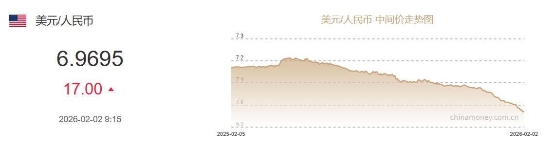 2月2日人民币对美元中间价报6.9695元 下调17个基点