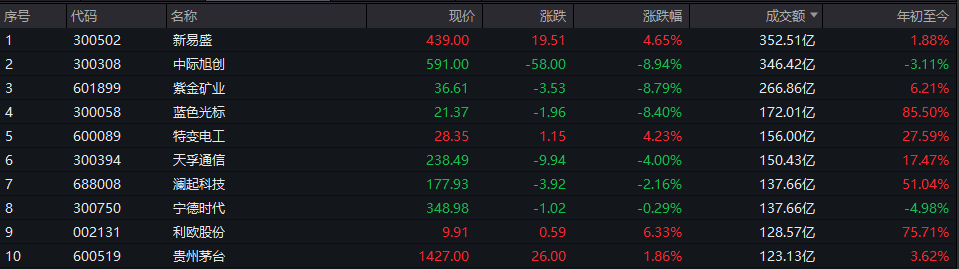 个股方面,新易盛成交额超352亿元居首,中际旭创、紫金矿业、蓝色光标成交额靠前。