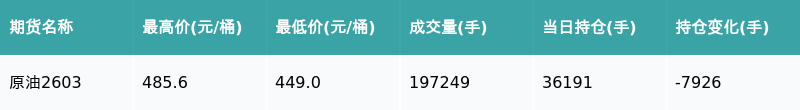 南财智讯2月2日电,盘后期货数据显示,上期能源的原油主力合约收跌7.02%,收盘报449.0元/桶,日内资金流出4.89亿元。其他相关指标见下表: