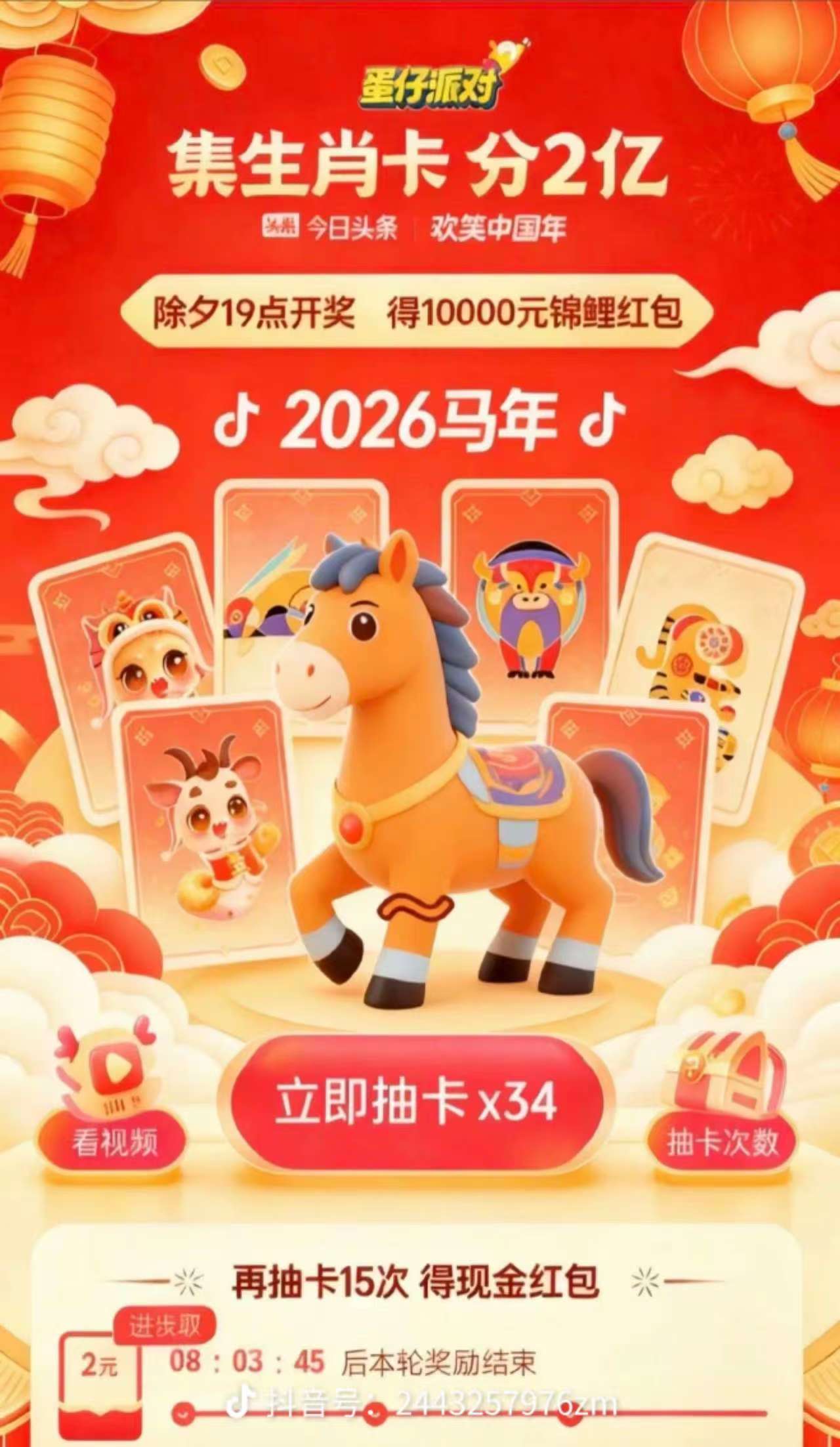字节跳动依托央视春晚独家AI云合作伙伴身份,以豆包App与抖音为核心载体,投入5亿元现金打造“AI互动+集卡瓜分”双主线活动。活动分为两大阶段:一是抖音“欢笑中国年”集卡活动,1月26日-2月16日期间,用户搜索“新春来抓马”即可参与收集9种语音祝福马,按集齐数量阶梯兑奖:3种可兑5元、5种兑20元、7种兑500元、9种兑2026元现金,2月3日起同步开启“集祥马卡分3亿”活动,除夕19:30拼手气瓜分现金池,前N名集齐者可获锦鲤红包。