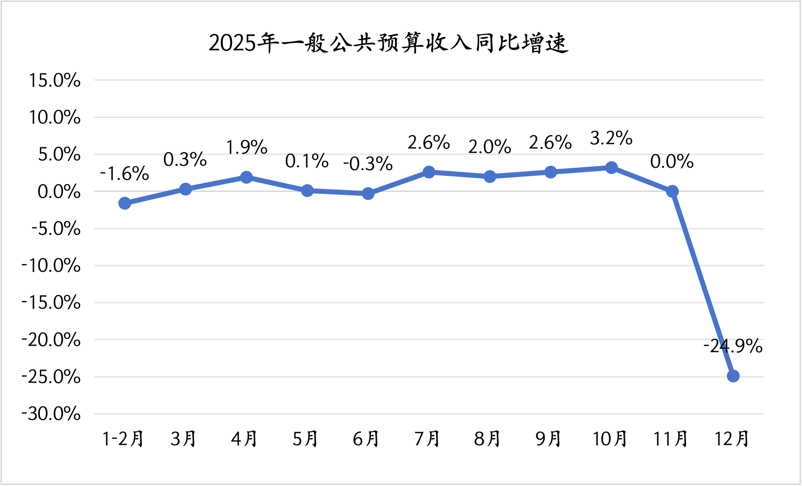 财政部数据显示,2025年,全国一般公共预算收入比上年下降1.7%,完成预算目标的98.3%,一般公共预算支出比上年增长1%,完成预算目标的96.8%。