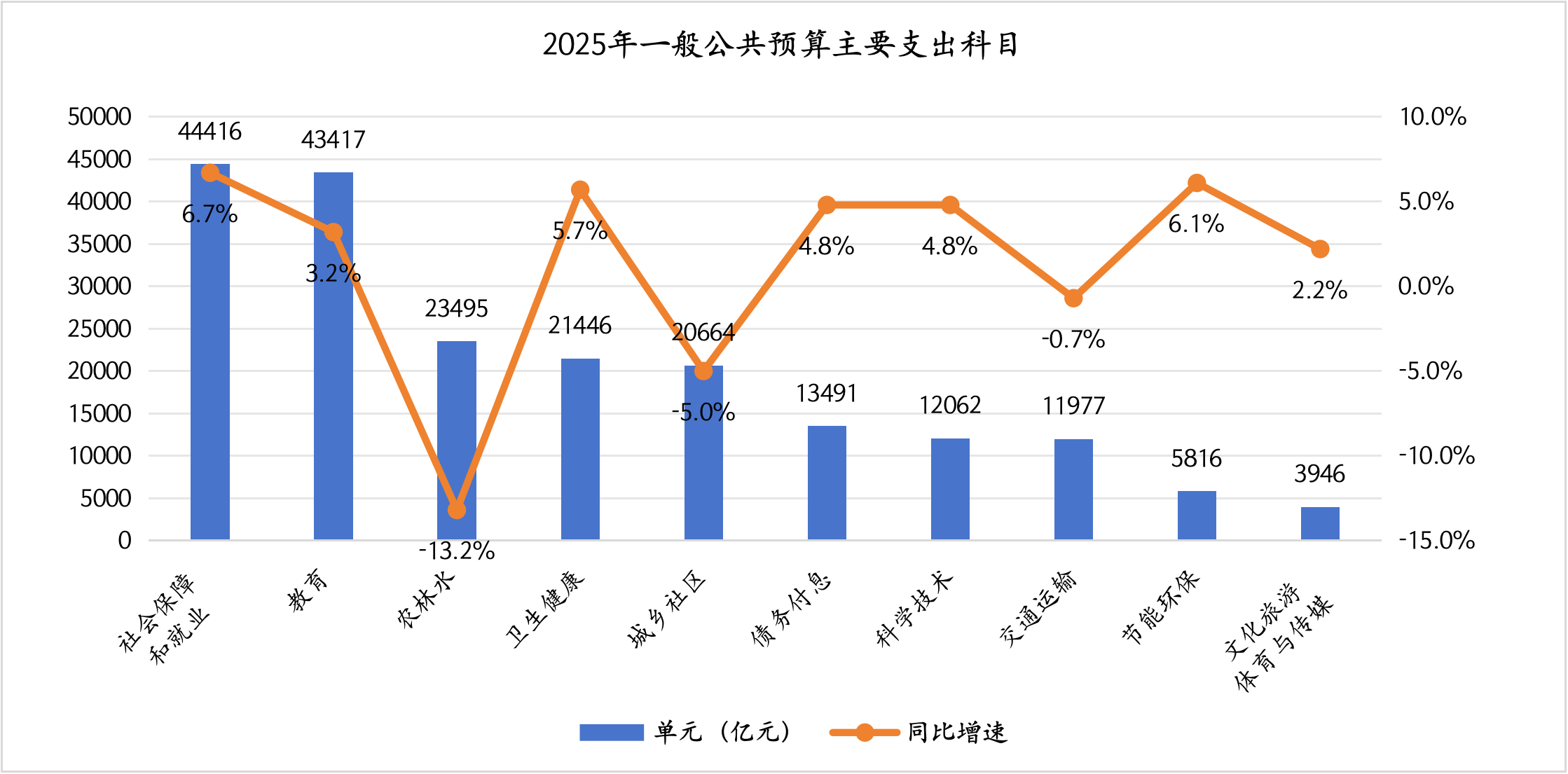 张迪分析指出,2025年,城乡社区、农林水、交通运输、节能环保四项基建合计支出增速降至-6.6%,比2024年下降13个百分点,主要和新项目储备接续不足以及资金向化债领域倾斜影响有关。民生支出方面,社保就业、教育、文旅支出增速均较上年有不同幅度改善。