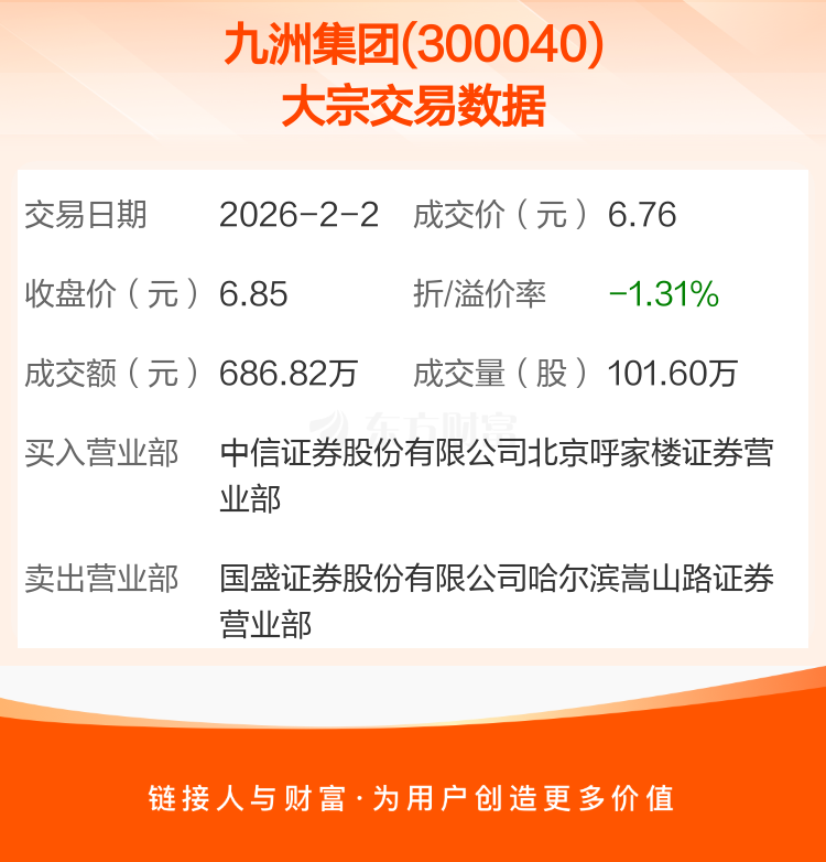2026年2月2日,九洲集团发生1笔大宗交易,共成交101.60万股,成交金额686.82万元,占其流通市值比例为0.19%。