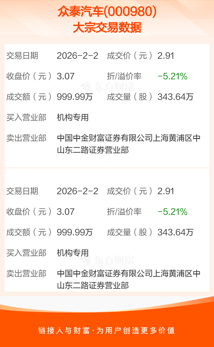 2026年2月2日,众泰汽车发生2笔大宗交易,共成交687.28万股,成交金额1999.98万元,占其流通市值比例为0.13%。