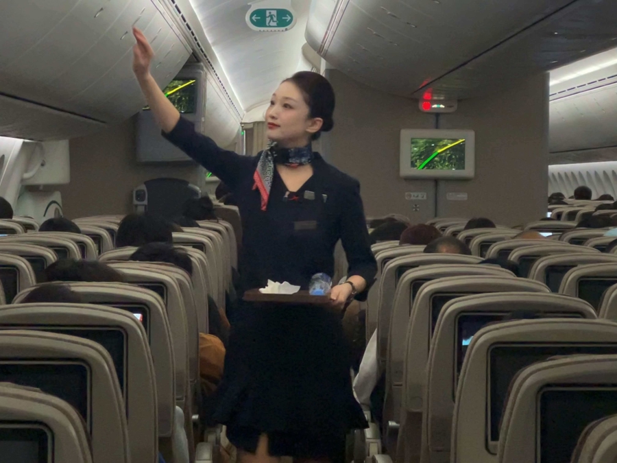 今年春运,东航14架C919全部投入运行,且客座率维持高位,张梦滢在春运期间几乎都投入C919航班任务。“C919运营两年多了,依然‘有光环’。”她笑着说,很多旅客一上飞机,就会拍机舱前面的印有“C919”字样的名牌,他们会关心地询问这是第几架C919,还会主动找乘务员合影、了解客舱局域网的用法,“看着他们对国产大飞机好奇和喜爱的样子,我也很开心。”