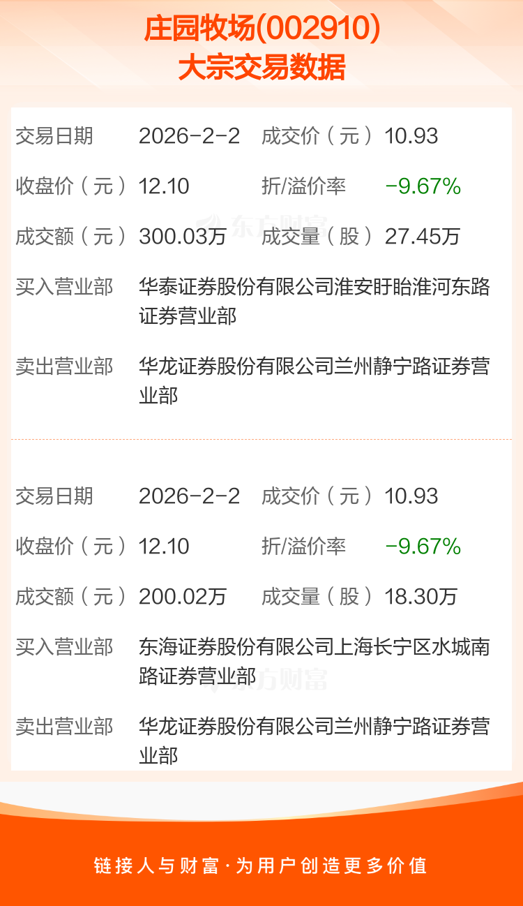 2026年2月2日,庄园牧场发生2笔大宗交易,共成交45.75万股,成交金额500.05万元,占其流通市值比例为0.24%。