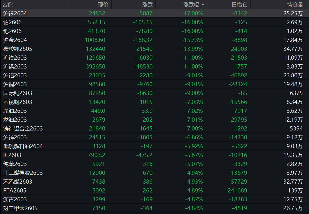 2月2日午后,国内期货市场有超过10个期货品种主力合约封住或触及跌停,涉及黄金、白银、铂、钯、铜、铝、镍、原油、碳酸锂等。