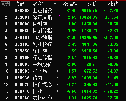 盘面看,前期爆炒的“涨价概念”变“跌停潮”——有色、煤炭、钢铁、石油、黄金板块分别下挫7.70%、5.35%、5.81%、3.76%、6.80%,大批个股连续两天跌停。农林牧渔板块跌幅也达3.31%,其中种业、粮食、水产品、猪肉、鸡肉跌幅分别为6.65%、4.24%、3.57%、2.97%、2.43%。