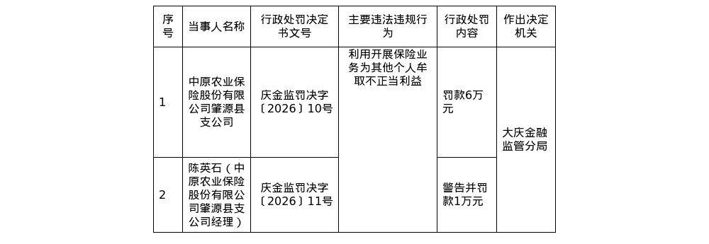 罚单显示,中原农业保险股份有限公司肇源县支公司的主要违法违规行为是:利用开展保险业务为其他个人牟取不正当利益。