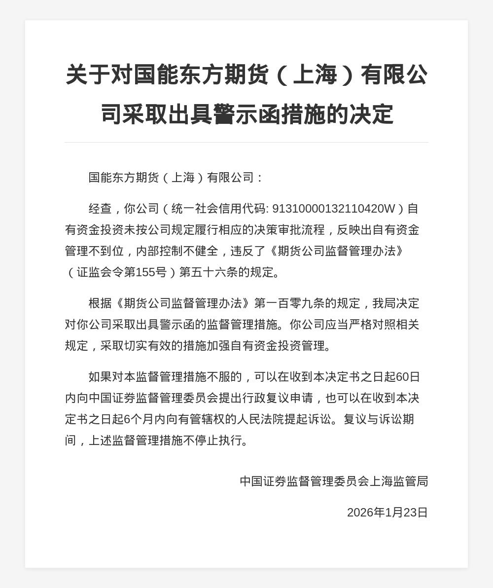 对此,中国证券监督管理委员会上海监管局决定对国能东方期货(上海)有限公司采取出具警示函的监督管理措施。