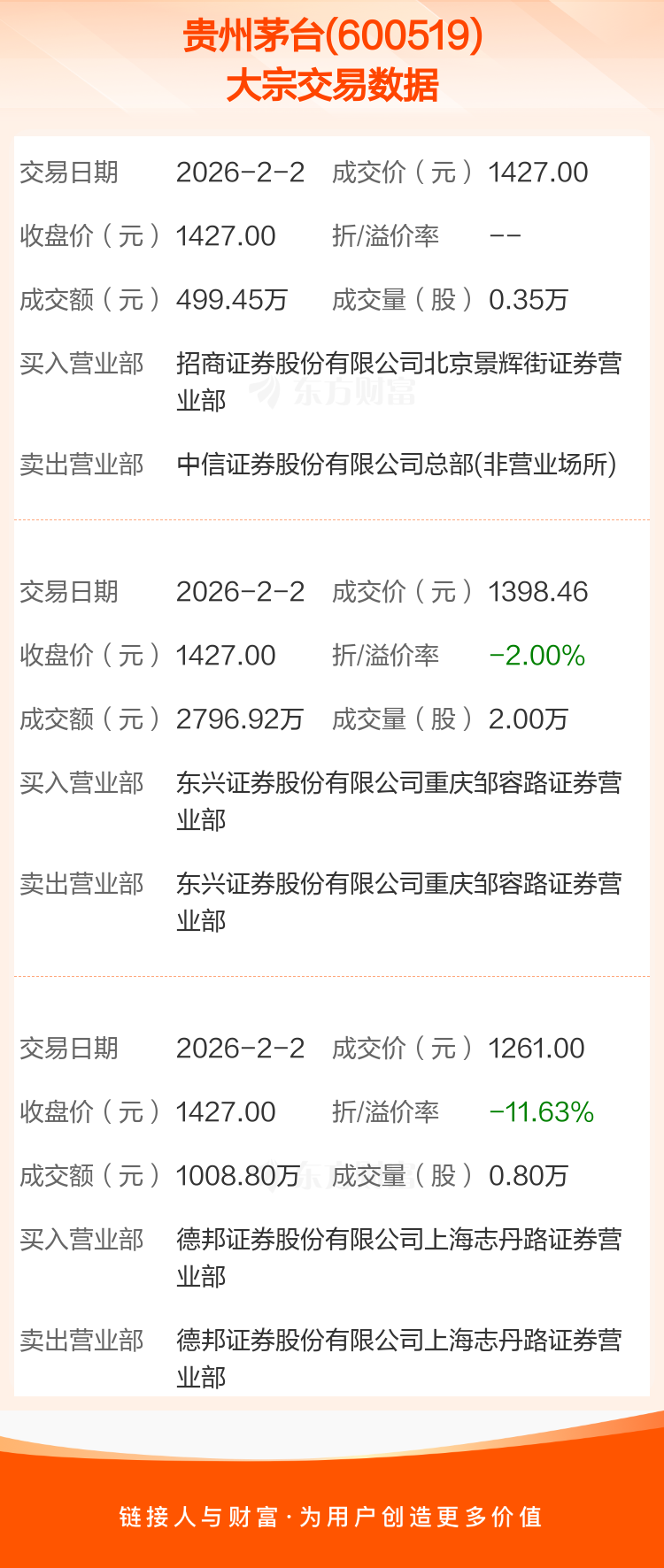 2026年2月2日,贵州茅台发生3笔大宗交易,共成交3.15万股,成交金额4305.17万元。