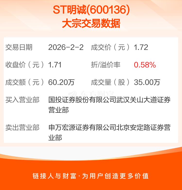 2026年2月2日,ST明诚发生1笔大宗交易,共成交35.00万股,成交金额60.20万元,占其流通市值比例为0.02%。