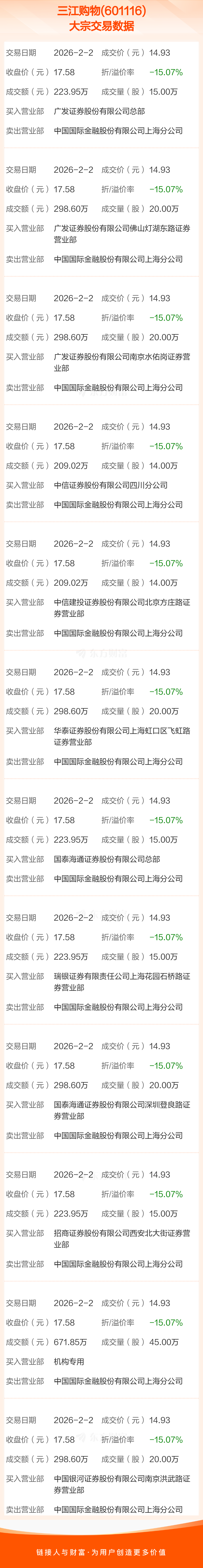 2026年2月2日,三江购物发生12笔大宗交易,共成交233.00万股,成交金额3478.69万元,占其流通市值比例为0.36%。