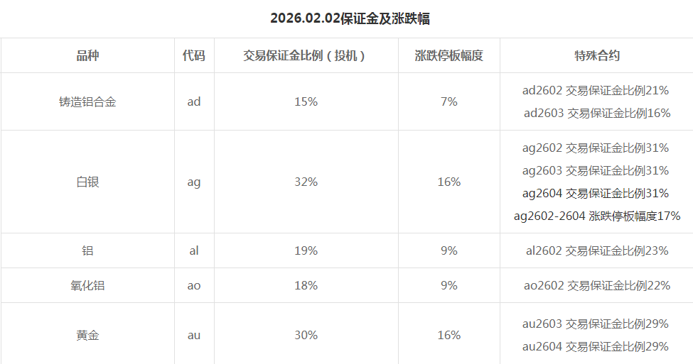 仅以某头部期货公司为例,2月2日的金、银期货投机保证金比例已经上调至30%和32%,其他工业金属也增加至18%以上,多保持在相关品种单日涨跌幅的2倍左右。