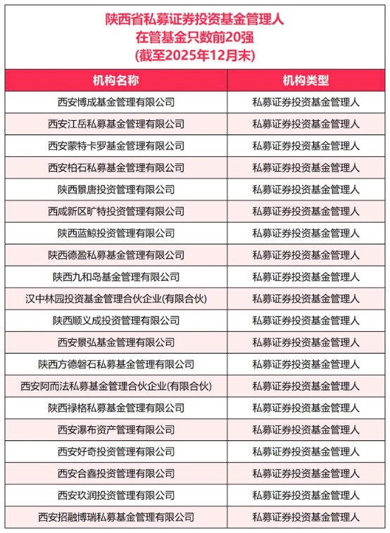 据统计,截至2025年12月末,陕西省私募证券投资基金管理人在管基金规模前20家管理人在管基金规模总计123亿元,占陕西私募基金备案总量的88.25%;在管基金只数前20家管理人在管基金数量共309只,占陕西私募基金备案总量的74.64%。