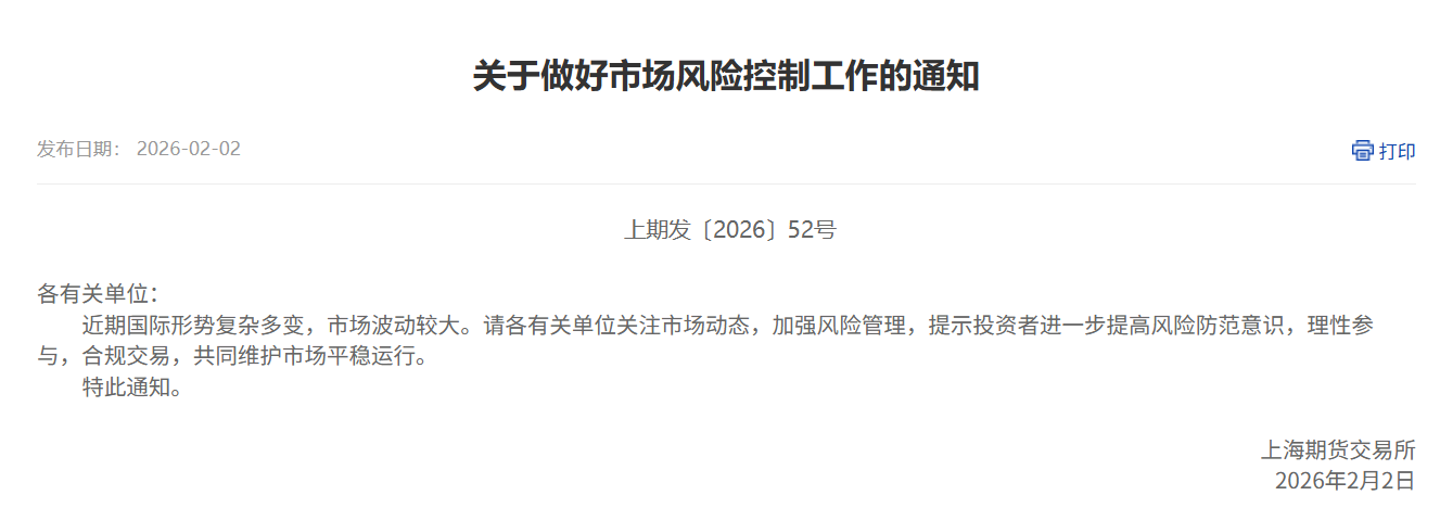 2月2日,上海期货交易所发布《关于做好市场风险控制工作的通知》:近期国际形势复杂多变,市场波动较大。请各有关单位关注市场动态,加强风险管理,提示投资者进一步提高风险防范意识,理性参与,合规交易,共同维护市场平稳运行。