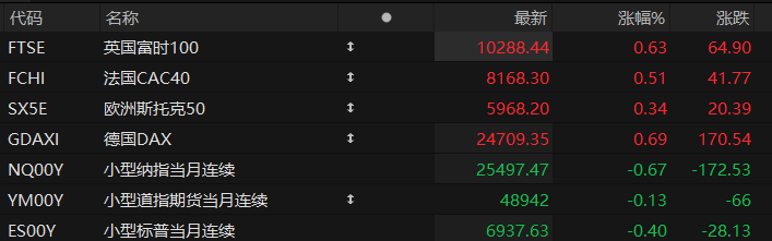 周五盘前,美股三大股指期货齐跌,欧洲主要指数普遍上涨。截至发稿,纳斯达克100指数期货跌0.67%,道指期货跌0.13%,标普500指数期货跌0.40%。