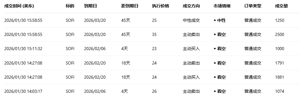 SoFi Technologies收跌6.36%,成交102.12万份期权合约,看跌/看涨成交量比降至0.65。SoFi Technologies发布第四季度财报超预期,调整后营收首次突破10亿美元达10.25亿美元同比增长37%,调整后每股收益0.13美元超出预期,并上调2026年全年业绩指引。