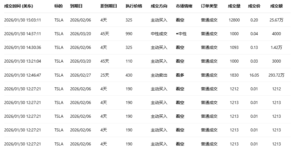 特斯拉收涨3.32%,成交366.58万份期权合约,看跌/看涨成交量比降至0.76。特斯拉发布四季度财报后股价先跌后涨,马斯克旗下SpaceX正探讨与特斯拉或xAI合并,SpaceX计划6月IPO估值1.5万亿美元,特斯拉将停产Model S和X转向机器人出租车业务。