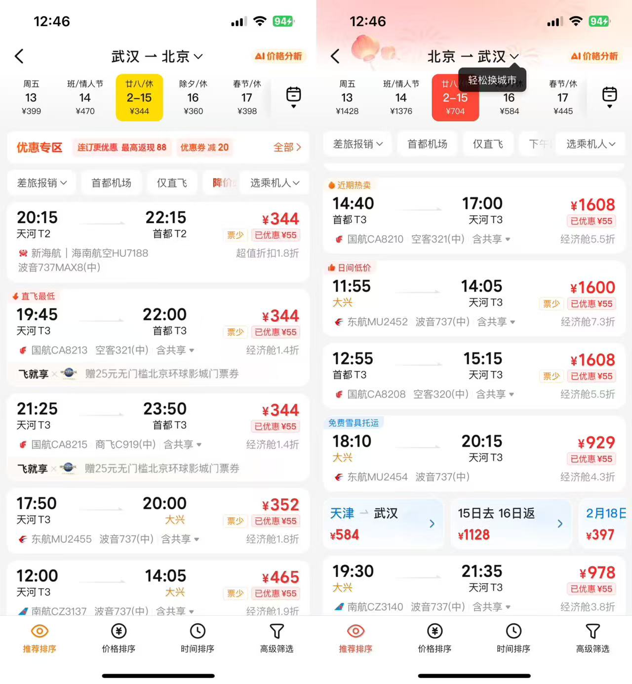 记者发现, “反向过年”出行方式机票价格优势显著。如2月14日当天,武汉飞北京仅需399元,而北京飞武汉则高达1479元,价差近千元。可见,“反向过年”出行流向一二线城市或小众目的地的,因票源充足,票价普遍比返乡方向低30%至50%,且错峰出行能避开拥堵。