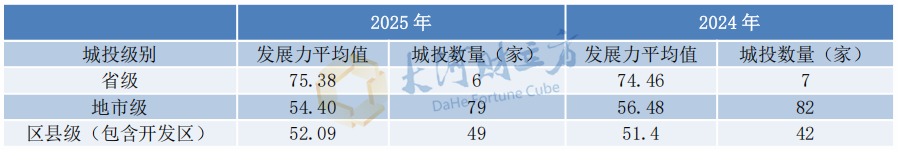 根据级别来看,各级别城投公司发展力指数平均值变化不一。其中,省级城投公司发展力指数平均值上升0.92分,地市级下降2.08分,区县级(包含开发区)上升0.69分。