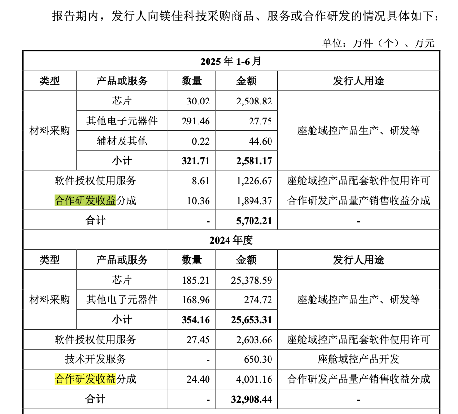 然而,上交所注意到,公司的座舱域控制器产品系与镁佳科技合作研发,并且向其支付合作研发收益分成,双方按照五五分成分享产品毛利;另外,在2023年和2024年,镁佳科技同时还是埃泰克的前五大供应商。按照第二轮问询回复披露的数据,2023年到2025年上半年发行人向镁佳科技支付的合作研发收益分成分别为861万元、4001万元和1894万元。