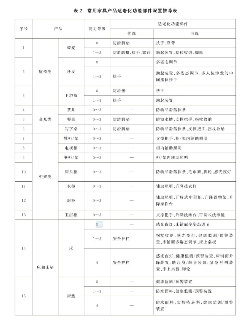 该标准按能力受损程度,由能力完好到能力完全丧失,将老年人划分为0、1、2、3、4共5个等级,建议家具厂商根据不同等级细化产品适老化功能部件的配置。以椅子凳子为例,能力等级为0(能力完好)的老人使用,推荐优先配置防滑脚垫,扶手、靠背作为备选;能力等级在1至3的老人使用,防滑脚垫、扶手、靠背都是推荐优先配置的部件,助起装置、拐杖收纳、脚轮则是备选。