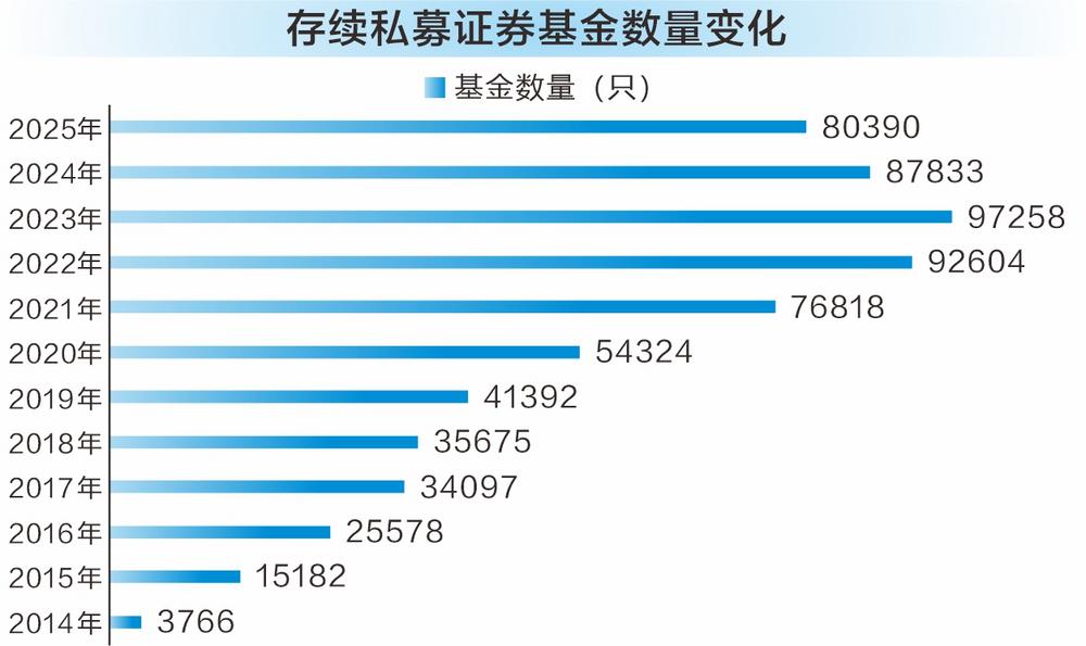 中国基金业协会近日披露的数据显示,截至2025年12月末,存续私募基金管理人19231家,管理基金数量超13.83万只,管理基金规模22.15万亿元,较2024年底的19.91万亿元增长2.24万亿元。其中,私募证券基金管理规模7.08万亿元,较2024年底的5.21万亿元增长1.87万亿元,即此轮私募总规模的增长主要来自于私募证券基金。